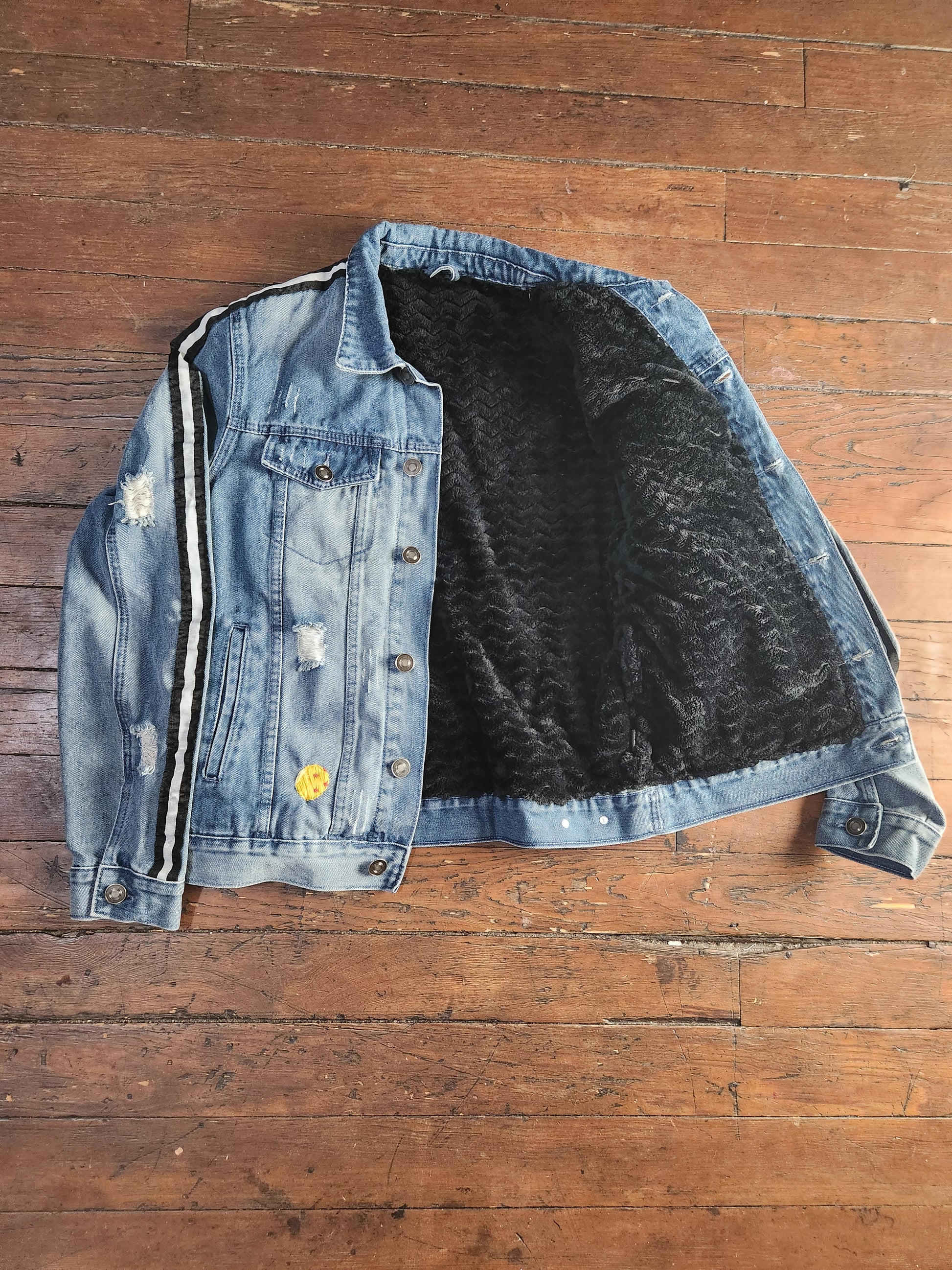 Faux fur lined Denim jacket hand distressed goku on back hand embroidery dragonball on front