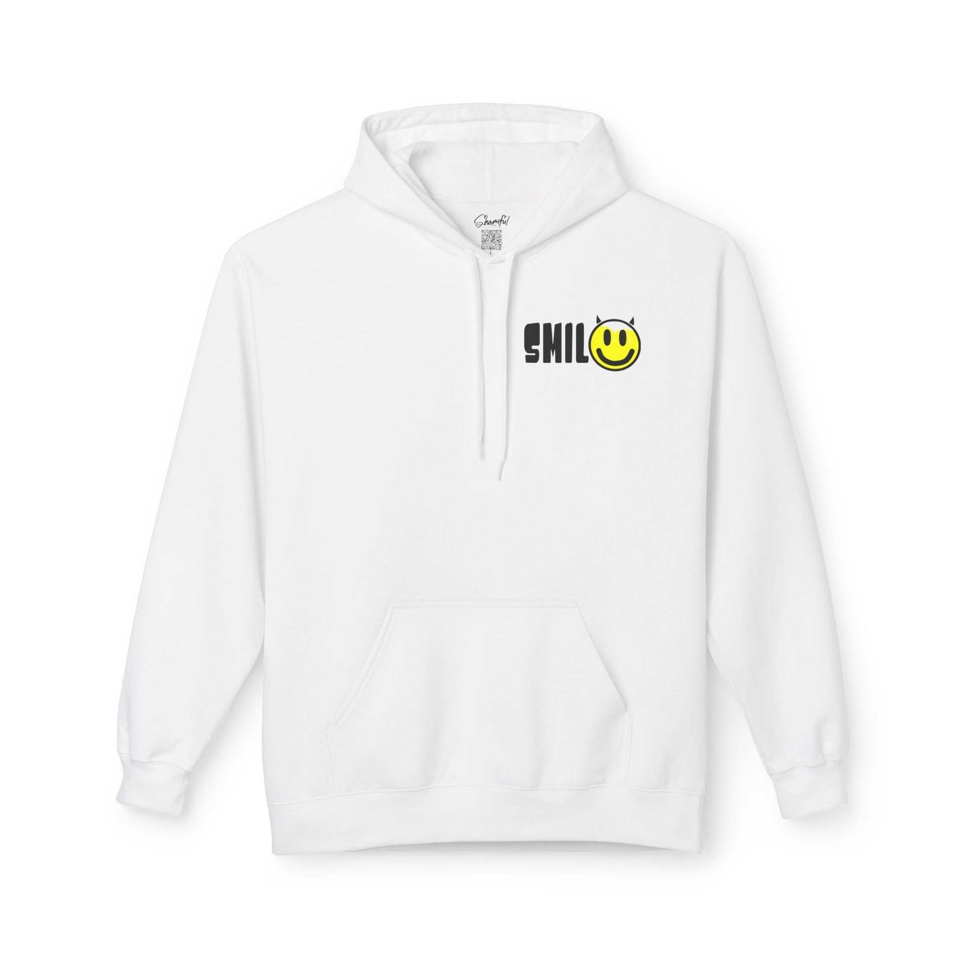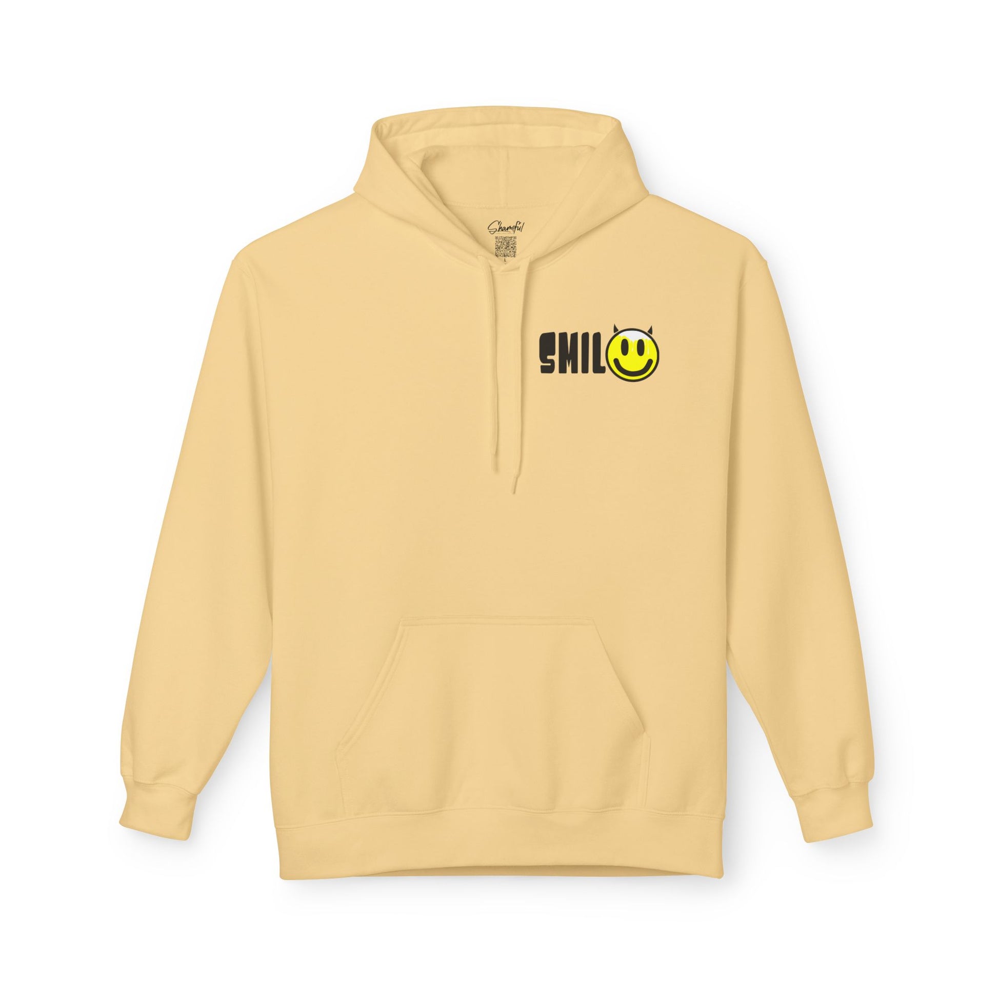 A cozy midweight hoodie that reads like a quiet, confident mood. The front keeps it playful — a compact, slightly retro smile graphic sits near the chest, adding a bright, ironic touch. The back opens into a softer moment: delicate, hand-scripted lettering reading “Smother me in love,” paired with a simple line-drawing figure. Together the two sides feel like someone who’s equal parts cheeky and thoughtful — the kind of piece you pull on for late walks, coffee shop afternoons, or low-key shows.