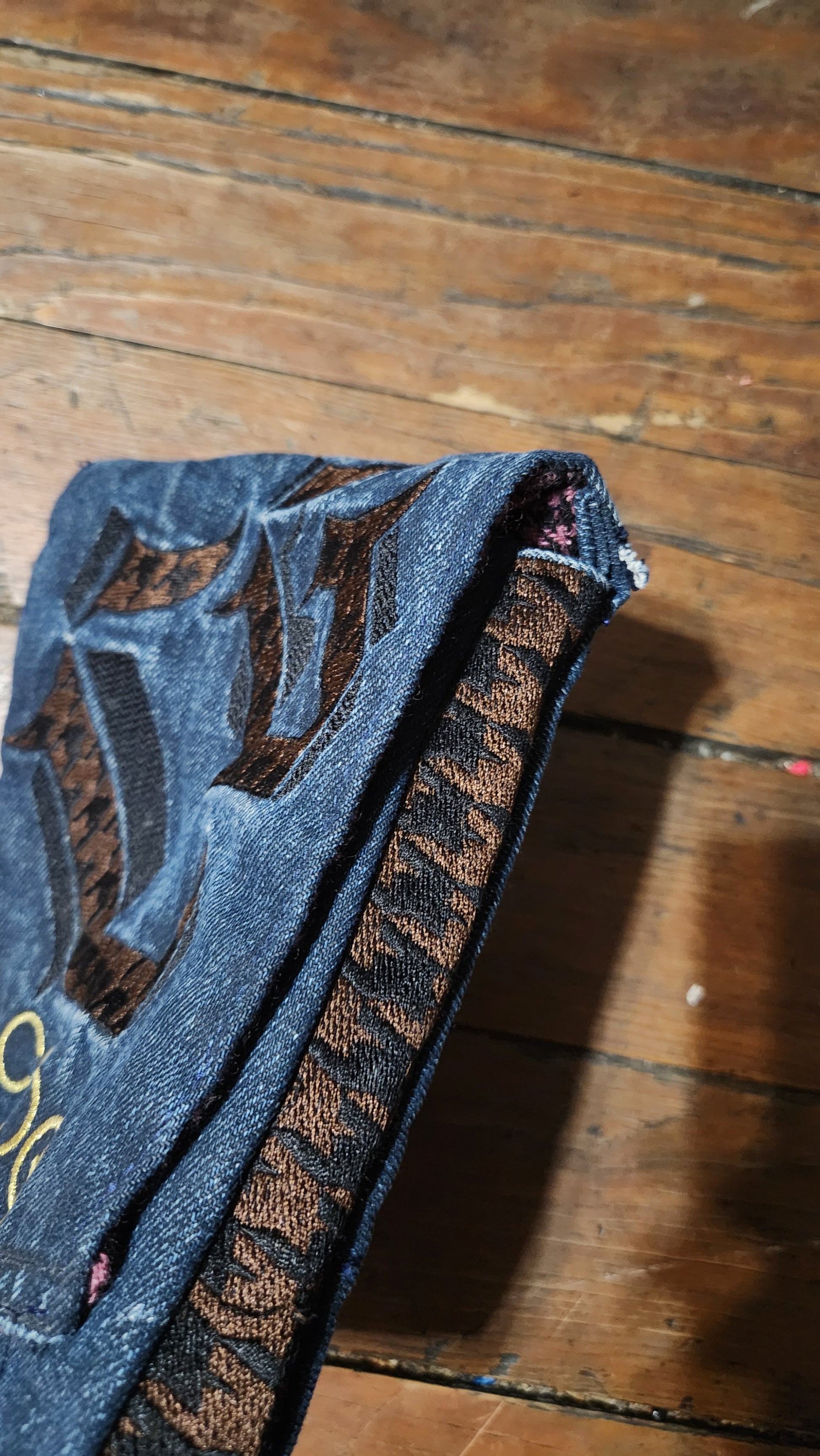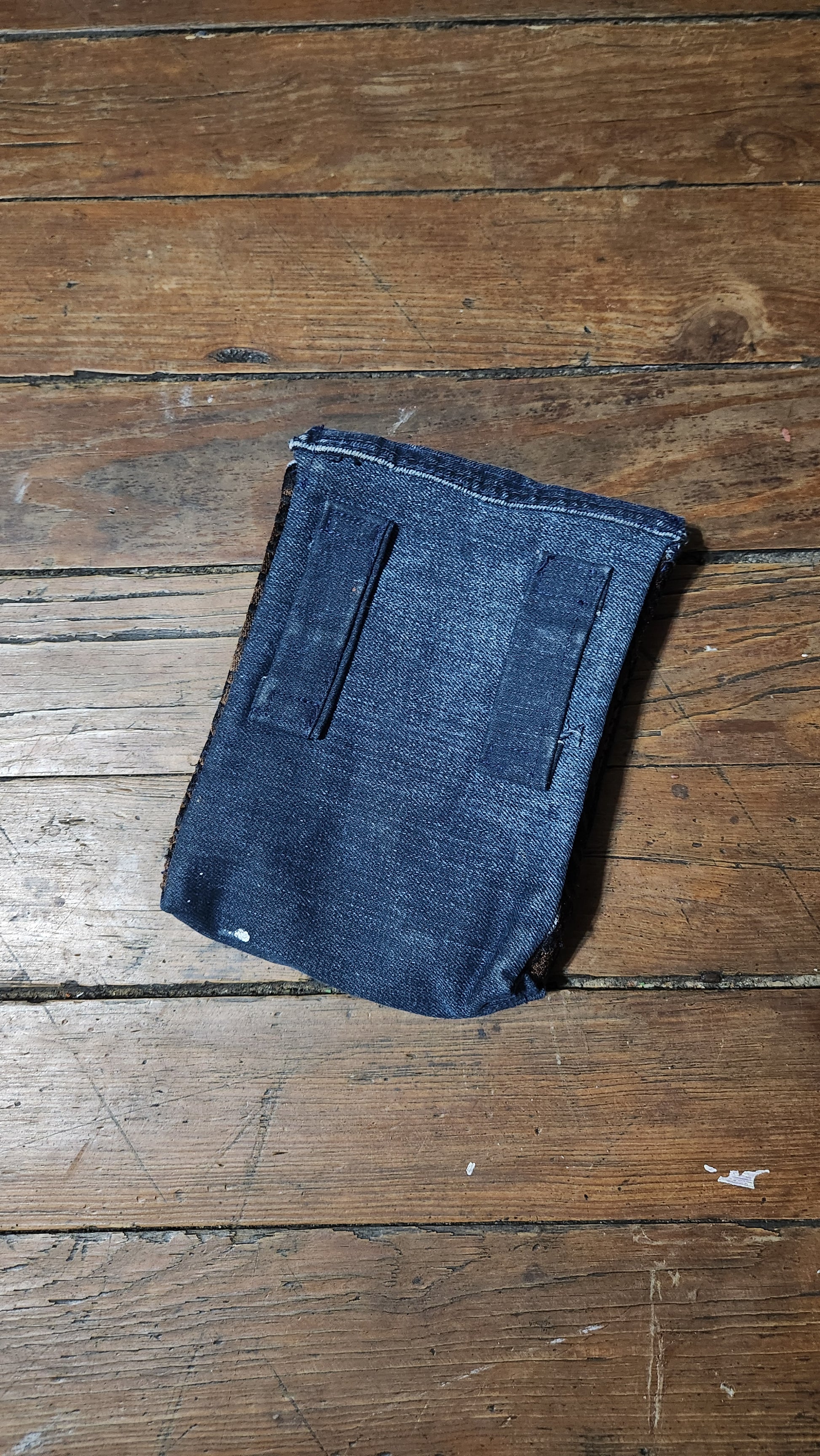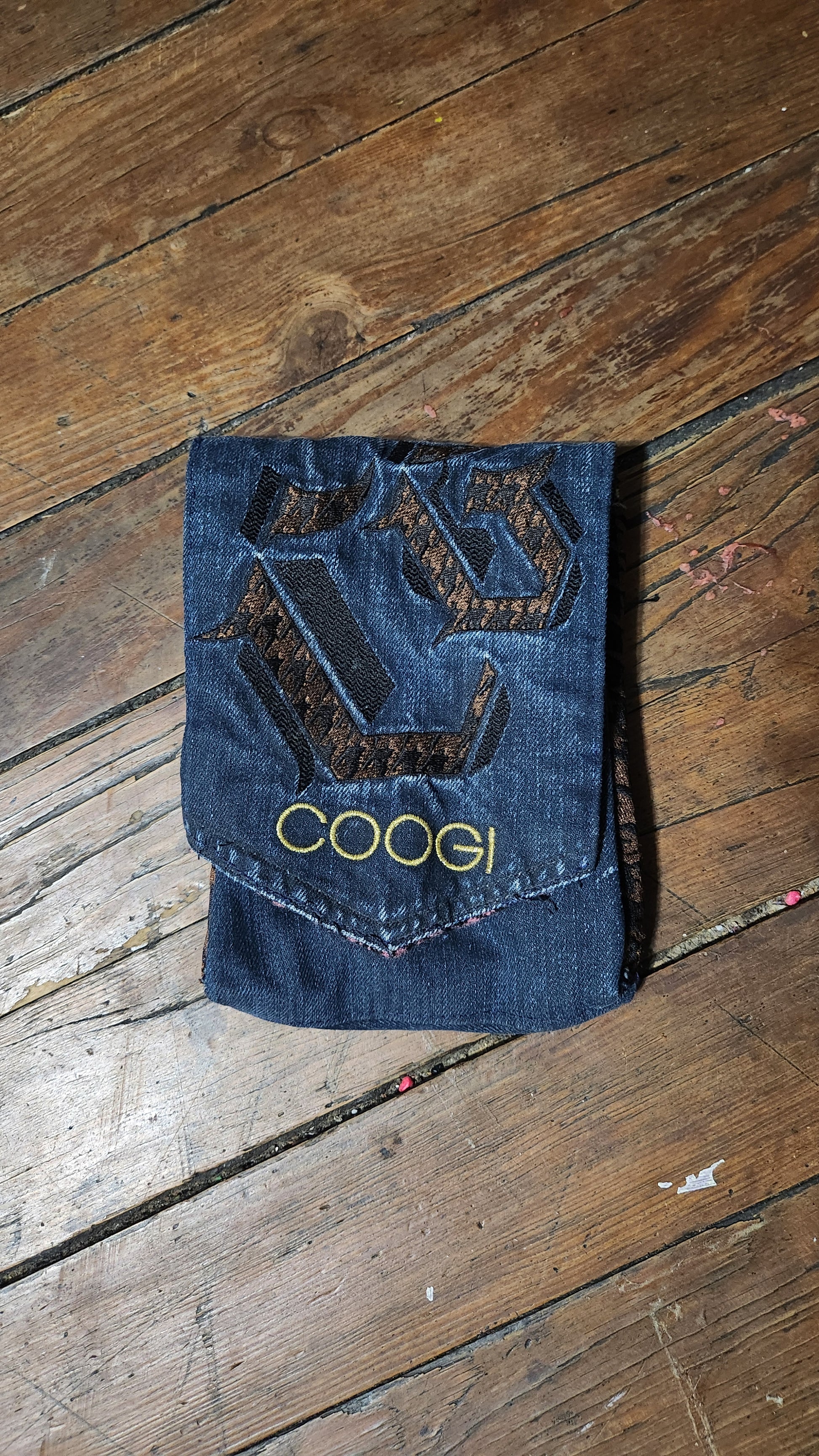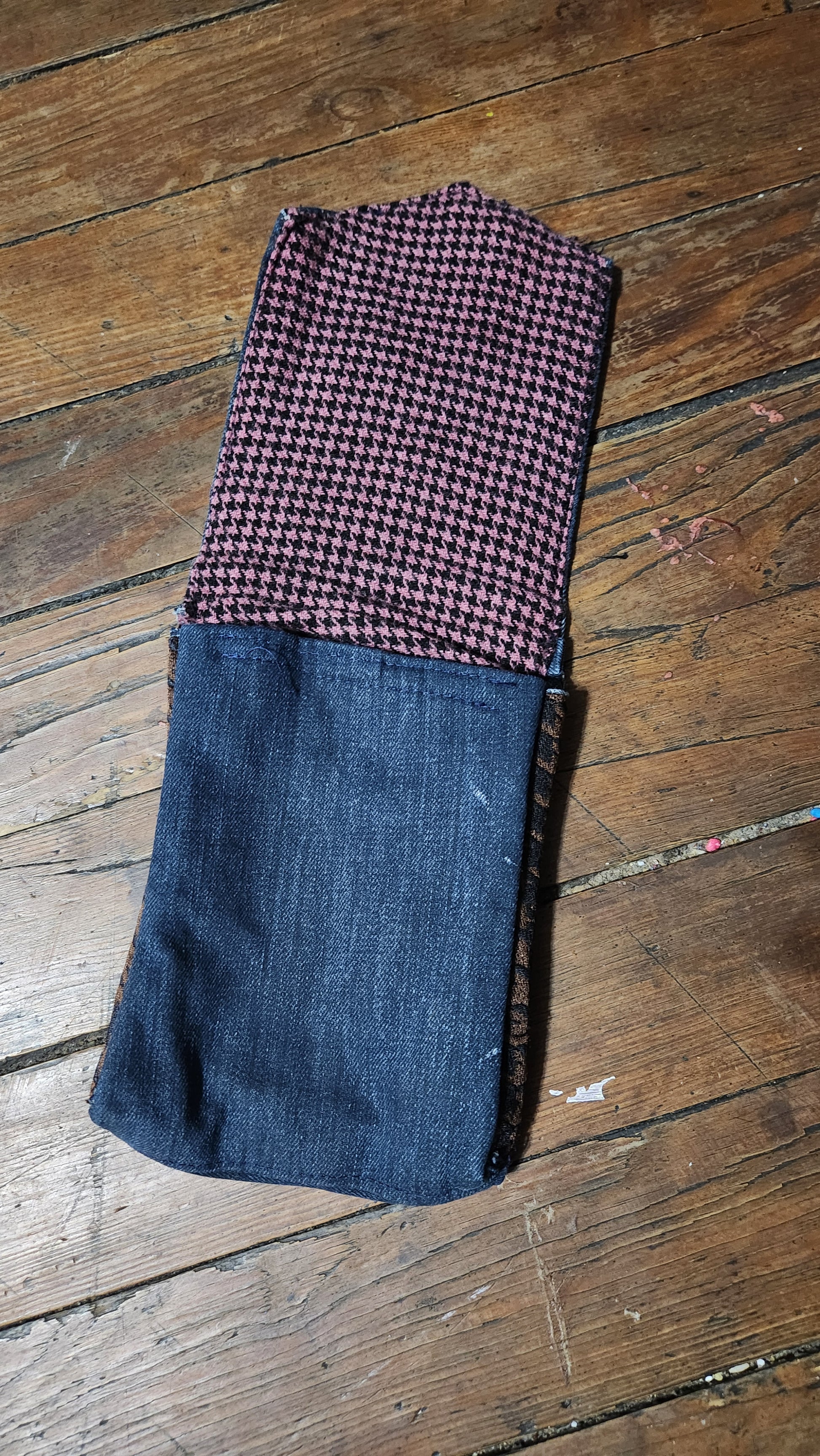 Upcycled Coogie Jean's and houndstooth jacket has a 2nd life as a belt / leg bag.